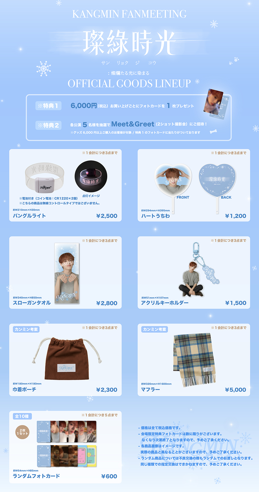 「2026 KANGMIN FANMEETING '璨綠時光 : 燦爛たる光に染まる」オフィシャルグッズを6,000円(税込) ご購入ごとにフォトカードを1枚プレゼントいたします。